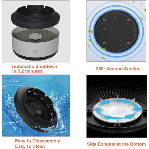 سیگار به اندازه کافی برای ما مضر است ولی با این حال نیمی از ضرر دود سیگار متوجه اطرافیان ماست.این محصول با جذب دود سیگار و فیلتر کردن آن، تا حدود زیادی بوی ناخوشایند و سموم سیگار را فیلتر میکند و مانع از ضرررسیدن به اطرافیان میشود.زیر سیگاری الکتریکی مکنده دود دارای فن مکنده دود سیگار ،محل قراردادن سیگار روشن و همچنین محل ریختن خاکستر و ته سیگار است و با دارا بودن 3 فیلتر مختلف غبار گیر و کربن اکتیو ابری و کربن اکتیو فشرده، بوی سیگار و دیگر بوهای محل را میگیرد که نقش بوگیر و تصفیه هوا را دارد.همچنین این فیلتر ها باکتری و گرد و غبار را نیز فیلتر میکنند.در اینصورت شاهد هوایی پاکتر برای خود و اطرافیان خواهید بود.این محصول نیازی به برق ندارد و با دو عدد باتری قلمی مدت زیادی کار میکند.همچنین جنس بدنه از پلاستیک ABS میباشد و میتوان در آن از رایحه های خشبو کننده نیز استفاده کرد.